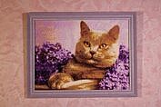 Милый котик, окруженный сиренью, не может не вызывать умиления. Красивые и сочные цвета и оригинальная композиция делают вышивку интересной и эффектной. Благодаря использованию стразов уже готовая работа на солнце будет излучать красивое сияние, создавая еще более необычную атмосферу.