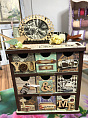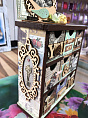 Маленькое произведение мебельного искусства, мини-комод с 9 ящичками. Детали корпуса выполнены из МДФ толщиной 6 мм, картонные ящички имеют размер 3,6х4х3,8 см и толщину 2 мм, внешние и внутренние поверхности оформляются скрапбумагой и тематическими наклейками. Также в комплекте идут набор фигурных чипбордов из фанеры толщиной 2 мм и декор (ленты, цветы, стразы, полубусины).