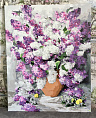 Сирень – красивый и живописный цветок вне зависимости от вида. Особенно хорошо смотрится сочетание двух видов сирени – белой и фиолетовой. Авторы картины (семья Захаровых), внесли в свое творение интересную деталь. Они добавили несколько желтых одуванчиков, которые не бросаются в глаза, но прекрасно дополняют композицию.