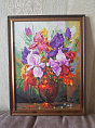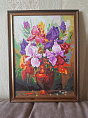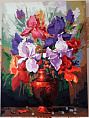 Ирисы очень живописны. Сам природа наделила их всеми цветами радуги, так что художникам остается лишь повторять за природой. Автор картины Антон Горцевич сумел подчеркнуть красоту ирисов, добавив к ним роскошную вазу не то из бронзы, не то из меди. Эта изысканная и винтажная ваза идеально вписывается в натюрморт.
