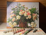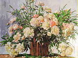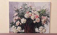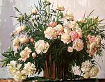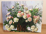 Картина по номерам «Пионовое настроение» Юрия Арсенюка с первого взгляда покоряет своей нежностью и трогательностью. От этого натюрморта практически невозможно оторвать взгляд. В цветовой гамме преобладают пастельные розовые, голубые и белые тона, которые слегка освежает насыщенно-темная зелень.