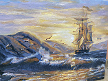 Вначале, как и положено, по номерам, получилось грубовато. Затем растушевала все границы на небе, прорисовывала волны, немного подправила парусник.